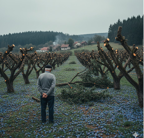 Jedne zimske noći, kada su se svi mirisni mirisi voćnjaka smirili pod slojem snijega, Milan je donio odluku koja će promijeniti njihov odnos zauvijek. U njegovoj glavi rodila se opsesivna ideja – uništiti Draganov trud. Ova želja za osvetom nije dolazila iz samoće ili bijesa, već iz dubokog osjećaja nepravde. Milan je, skrivajući se u tami, prešao u Draganov voćnjak s namjerom da uništi sve što je Dragan stvorio. Dok su se stabla rušila jedno po jedno, Milan je osjećao kako mu se srce ispunjava gorkim zadovoljstvom. Po prvi put, imao je osjećaj moći, ali to je brzo nestalo s prvim zracima sunca koji su osvijetlili njegovu besprizornu akciju.