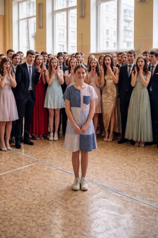 - Iako je bila ponosna na svoje rukotvorine i duboko emocionalno vezana za tu haljinu, nije mogla da predvidi reakcije svojih vršnjaka. Na samom ulazu u salu, pogledi su je pratili, a neko je čak nije mogao da zadrži smeh. Iako je bila spremna da se povuče, da jednostavno ode, odlučila je da uzme mikrofon i progovori.